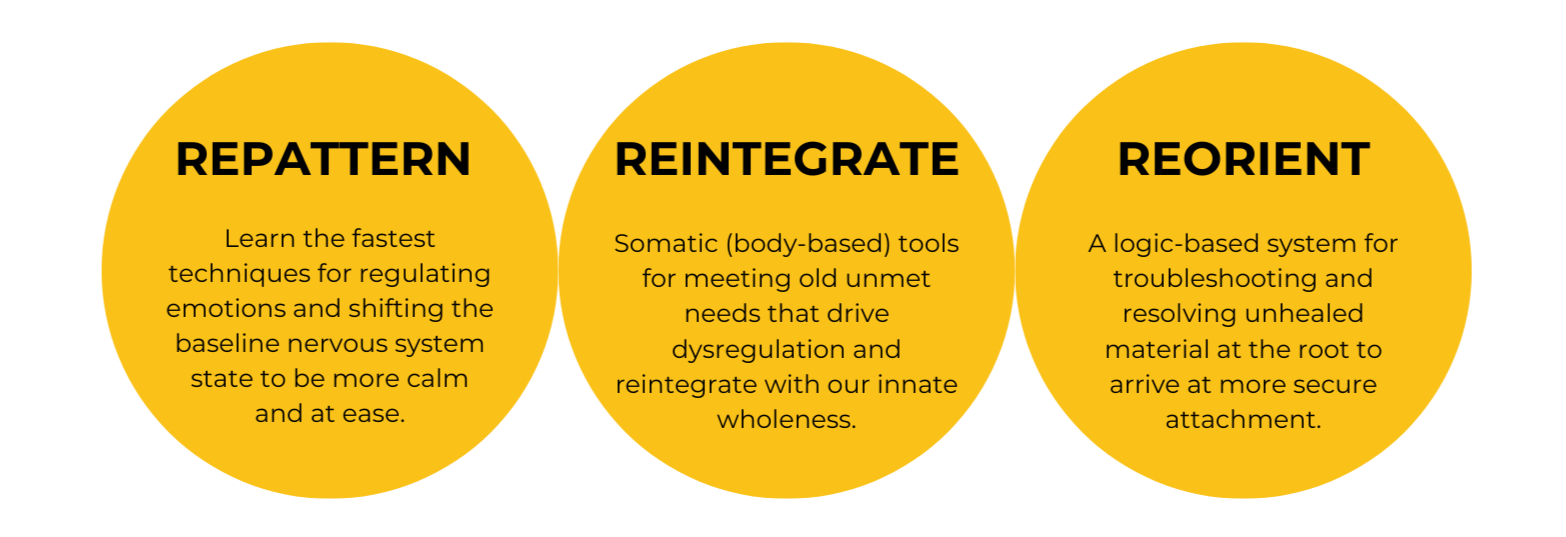 First, Repattern by learning fast, effective techniques to calm your nervous system and regain emotional balance. Then, Reintegrate by using somatic (body-based) tools to meet the old, unmet needs that drive patterns of stress and dysregulation. Finally, Reorient with a logic-based system designed to identify and resolve deep-rooted, unhealed experiences and move toward secure attachment to create lasting change from within. This method empowers you to move beyond surface-level coping and into true, sustainable healing, so you can step fully into the life you’re meant to live.